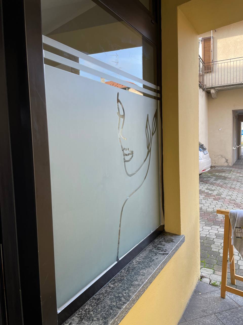 PVC adesivo microforato per visibilità dall’interno e opacità dall’esterno, per mantenere la privacy senza bloccare la luce naturale.